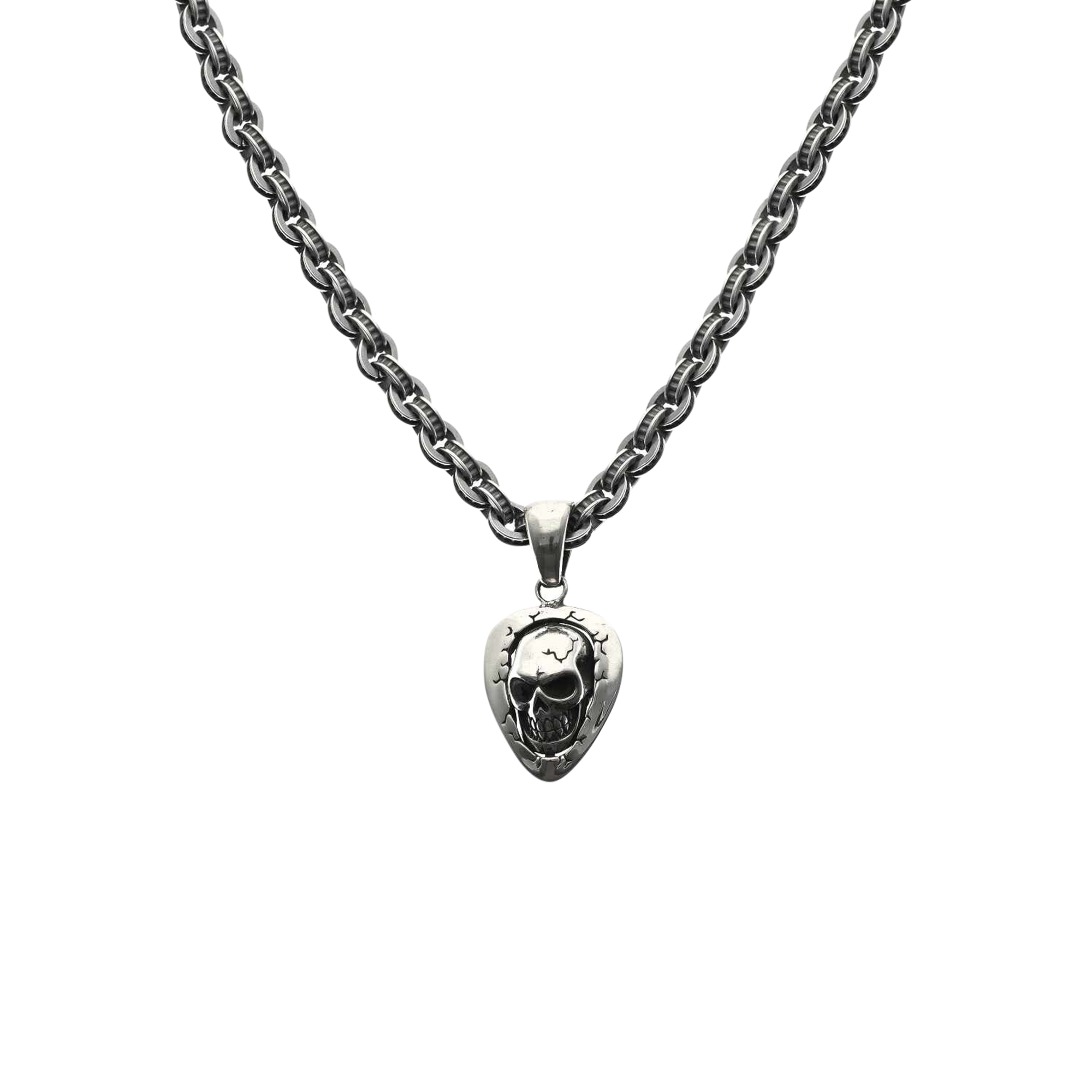 Collier chaine argent massive big fantaisie pendentif tête de mort et médiator pierre noire